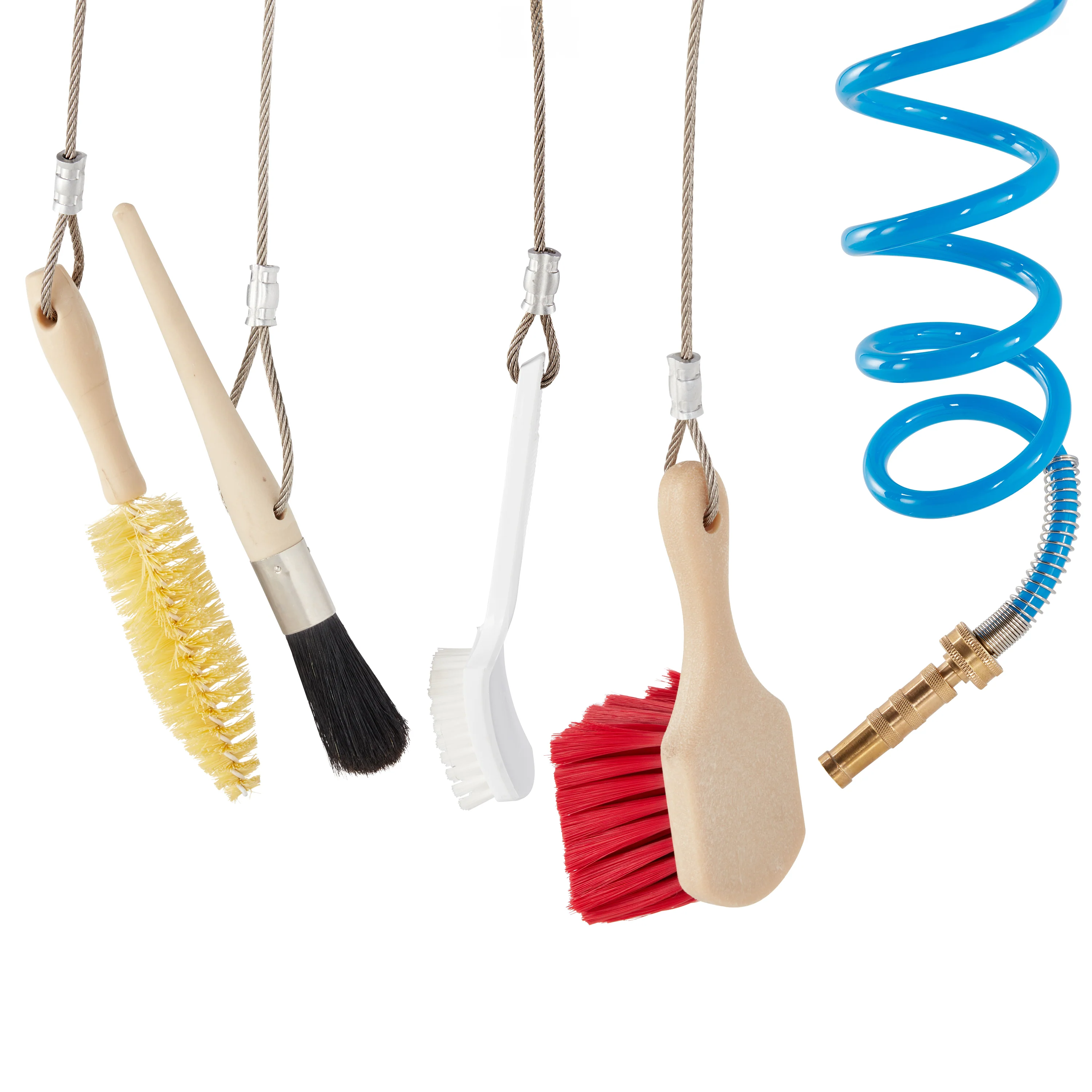 - Includes four brushes for various components, securely attached to prevent theft along with coiled hose and adjustable nozzle